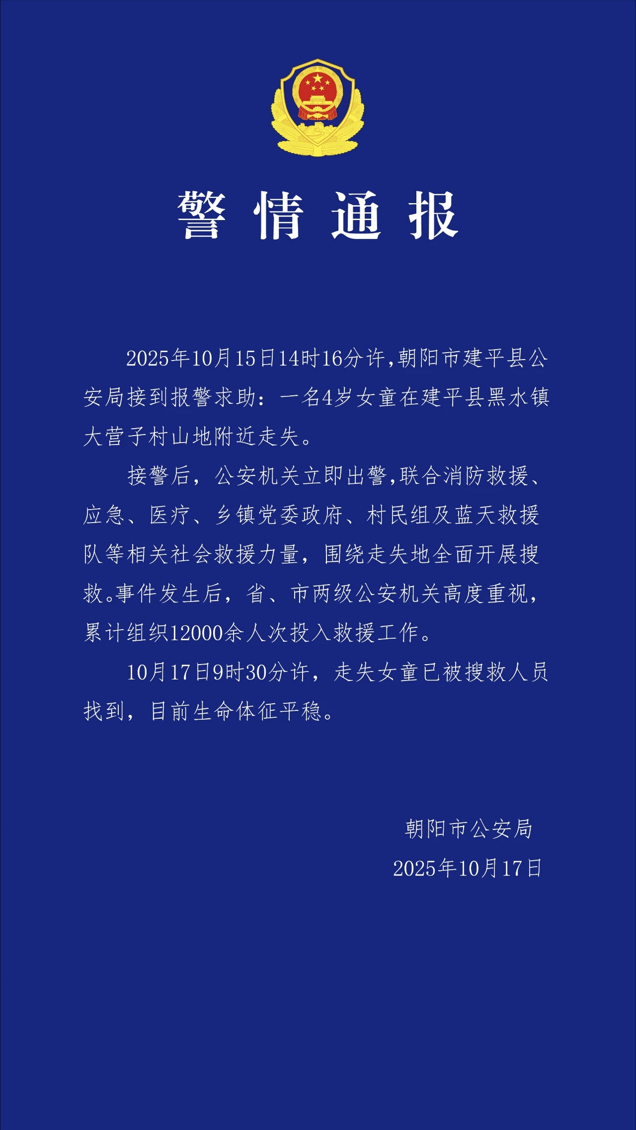 10月17日,辽宁朝阳市公安局发布通报:15日14时16分许,朝阳市建平县公安局接到报警求助:一名4岁女童在建平县黑水镇大营子村山地附近走失。17日9时30分许,走失女童已被搜救人员找到,目前生命体征平稳。