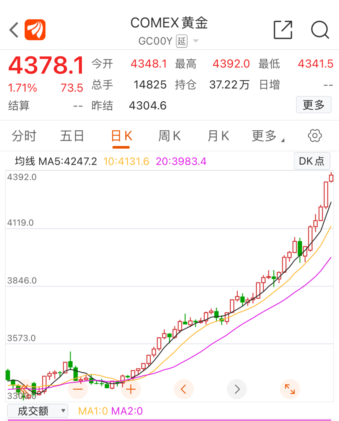 数据显示,截至10月17日7时,国际金价方面,COMEX黄金开盘走高突破4392美元/盎司,继续刷历史新高,国内投资金价超过了990元/克。年初至今,伦敦现货黄金涨幅已超60%。与此同时,截至10月17日上午7时,伦敦白银现货价格达到54.17美元/盎司,国内投资银价超过了12元/克,年内涨幅超过87%。