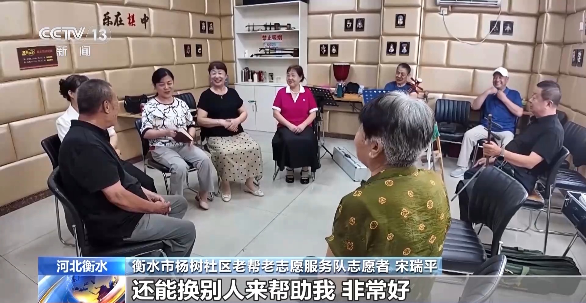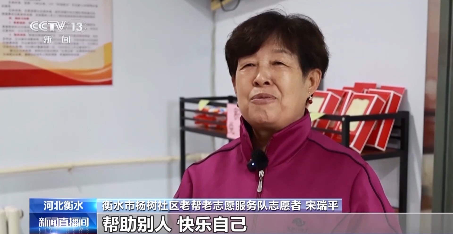 衡水市杨树社区老帮老志愿服务队志愿者 宋瑞平:虽然老了,但是不觉得自己老,帮助别人,快乐自己,咱们这个社会会更和谐。