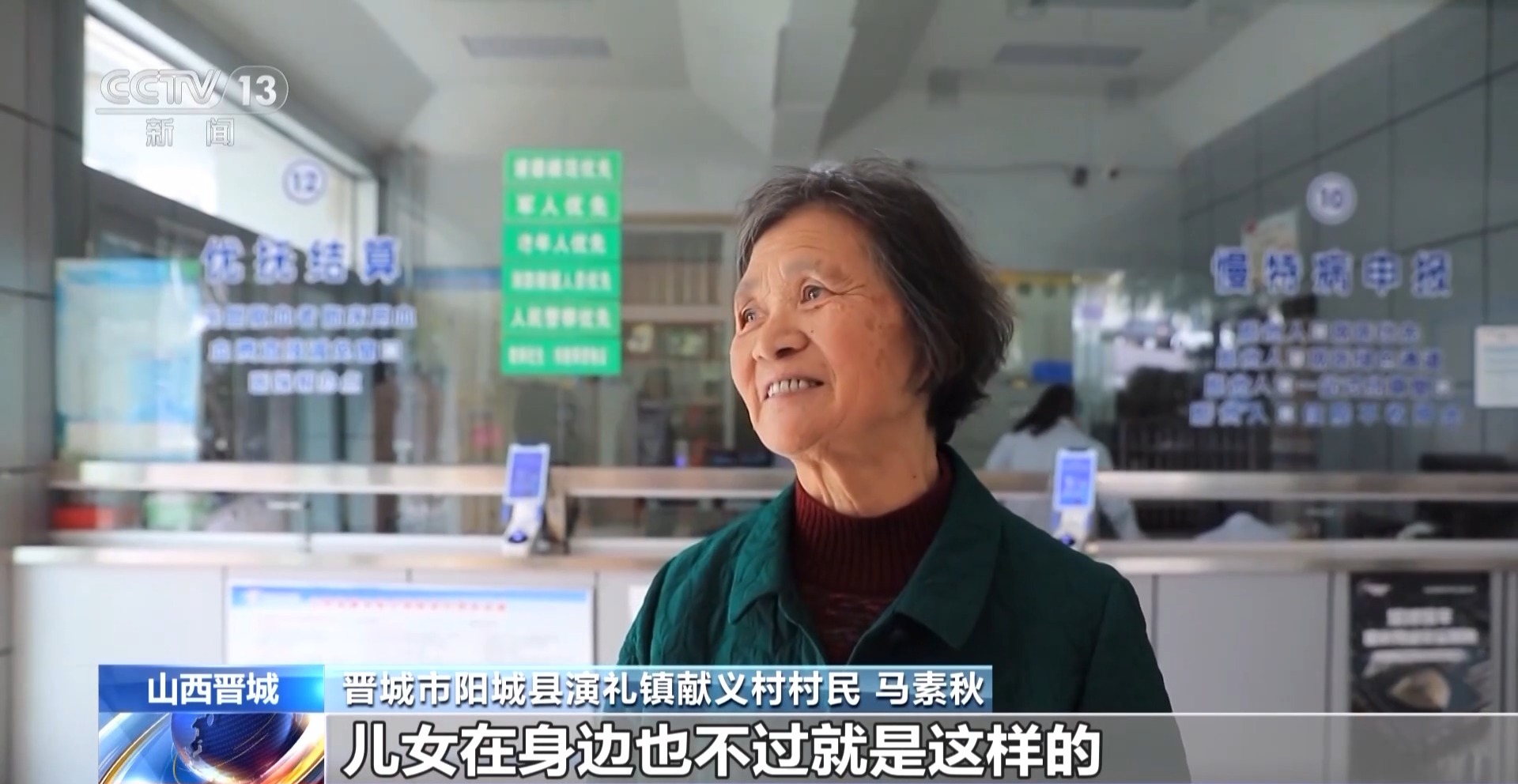 晋城市阳城县演礼镇献义村村民 马素秋:志愿者对我们老年人各方面都挺好的,儿女在身边也不过就是这样的。